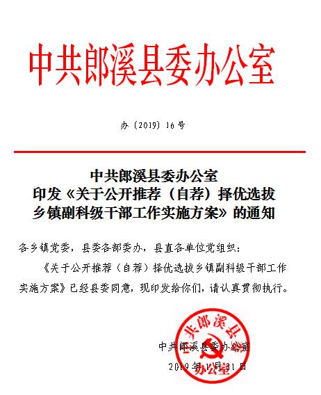 为深入贯彻习近平新时代中国特色社会主义思想和全国、全省、全市组织工作会议精神,进一步扩大选人用人视野、拓宽选拔任用干部渠道。根据《党政领导干部选拔任用工作条例》《公务员职务任免与职务升降规定(试行)》《事业单位领导人员管理暂行规定》等有关政策规定,结合我县干部队伍建设实际情况,决定面向全县公开推荐(自荐)择优选拔乡镇副科级干部。现制定实施方案如下: